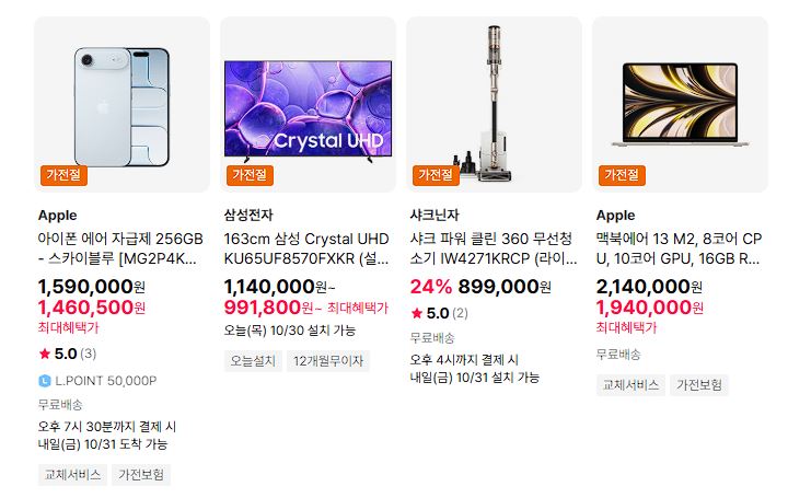 할인 품목 : 세탁기, 휴대폰, 청소기 등