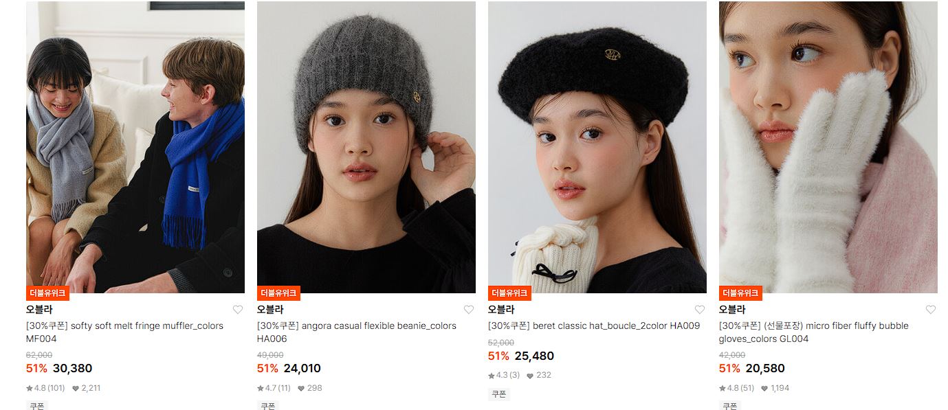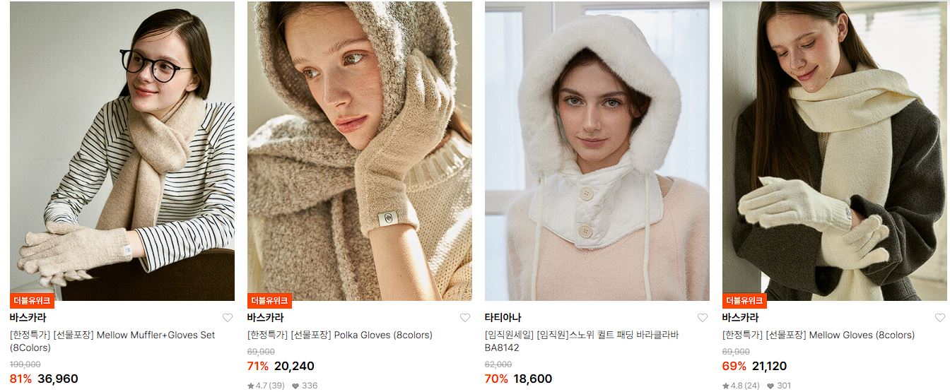 할인 품목 : 목도리, 장갑, 모자 등