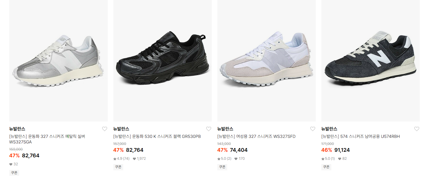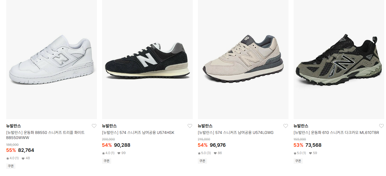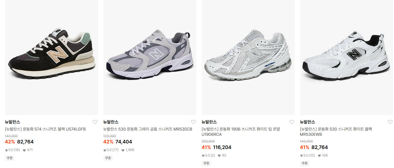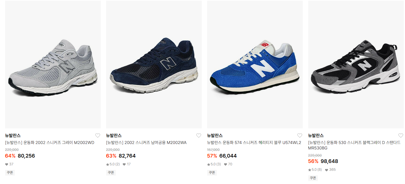 뉴발란스 다양한 제품을 할인 판매하네요.