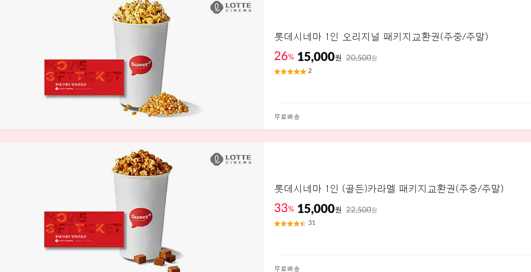 할인 품목 : 1인 오리지널 패키지 교환권, 1인 카라멜 패키지 교환권 등