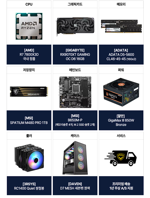 아싸컴 AMD 7800X3D+RX9070XT 16G+32GB+1TB 조립PC 할인 정보 [링크]