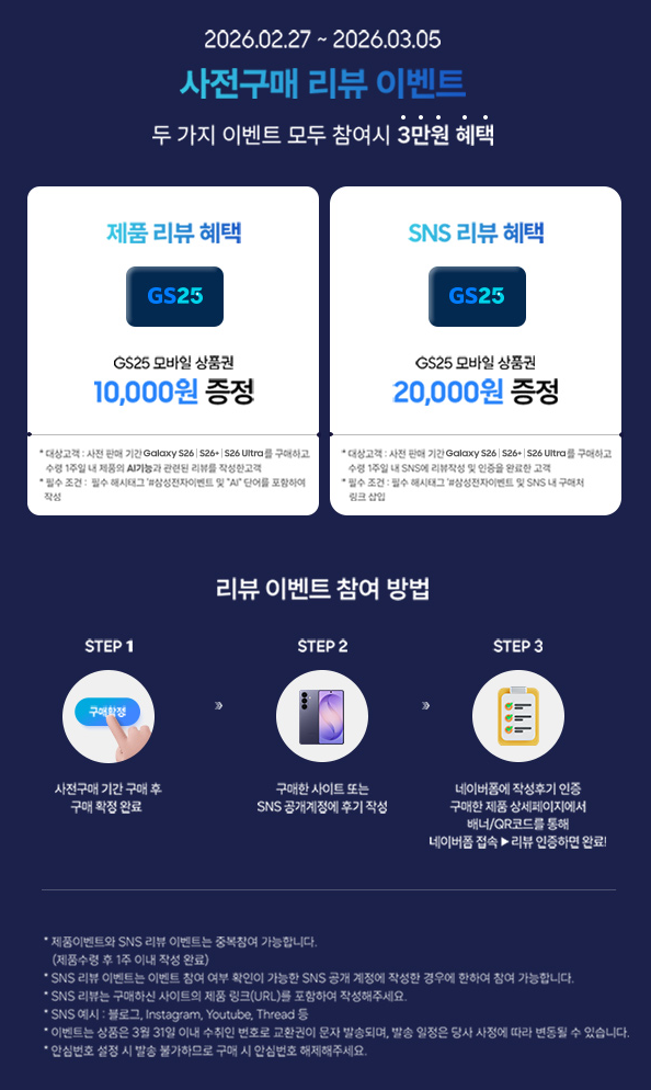 삼성 갤럭시 S26 시리즈 사전 구매 이벤트 정보 포스팅입니다.