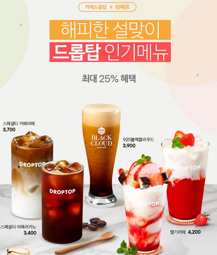 드롭탑 인기메뉴 최대 25% 할인 드롭탑 인기메뉴 최대 25% 할인 정보 포스팅입니다. 드롭탑 다양한 메뉴를 할인 판매하네요. 할인 메뉴 : 딸기라떼, 딸기 마블 플로트 등 드롭탑 인기메뉴 최대 25% 할인 정보 [링크] 핫딜/식품&생활 2021.02.10