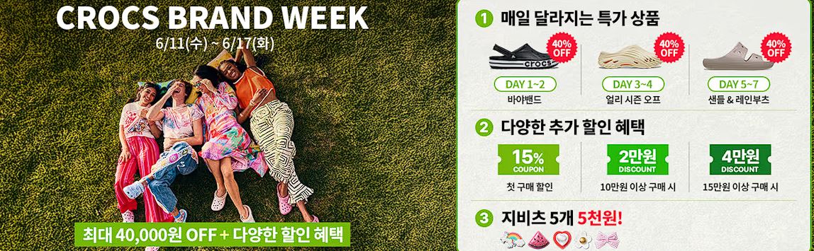 크록스 브랜드 위크 크록스 브랜드 위크 정보 포스팅입니다. 크록스 다양한 제품을 할인 판매하네요. 할인 품목 : 샌들, 슬리퍼 등 이벤트 기간 : 2025년 6월 17일까지 크록스 브랜드 위크 정보 [링크] 핫딜/패션&스포츠 2025.06.16