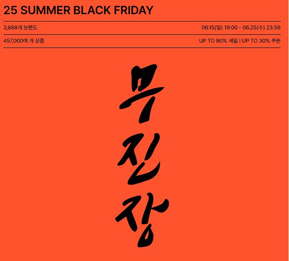 무신사 무진장 25 썸머 블랙 프라이데이 무신사 무진장 25 썸머 블랙 프라이데이 정보 포스팅입니다. 무신사 무진장 25 썸머 블랙 프라이데이 이벤트 예정이네요. 할인 품목 : 의류, 가방, 신발 등 이벤트 기간 : 2025년 6월 15일 오후 7시 ~ 2025년 6월 25일 무신사 무진장 25 썸머 블랙 프라이데이 정보 [링크] 핫딜/패션&스포츠 2025.06.15