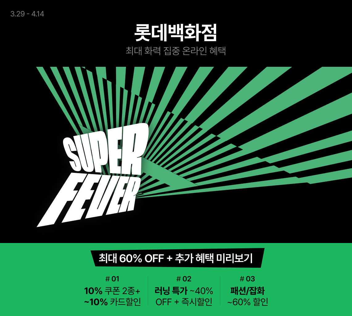 롯데백화점 SUPER FEVER 최대 60% 세일 롯데백화점 SUPER FEVER 최대 60% 세일 정보 포스팅입니다. 롯데백화점 다양한 제품을 할인 판매하네요. 할인 품목 : 의류, 신발, 화장품 등 이벤트 기간 : 2024년 3월 29일 ~ 2024년 4월 14일 롯데백화점 SUPER FEVER 최대 60% 세일 정보 [링크] 핫딜/패션&스포츠 2024.03.29