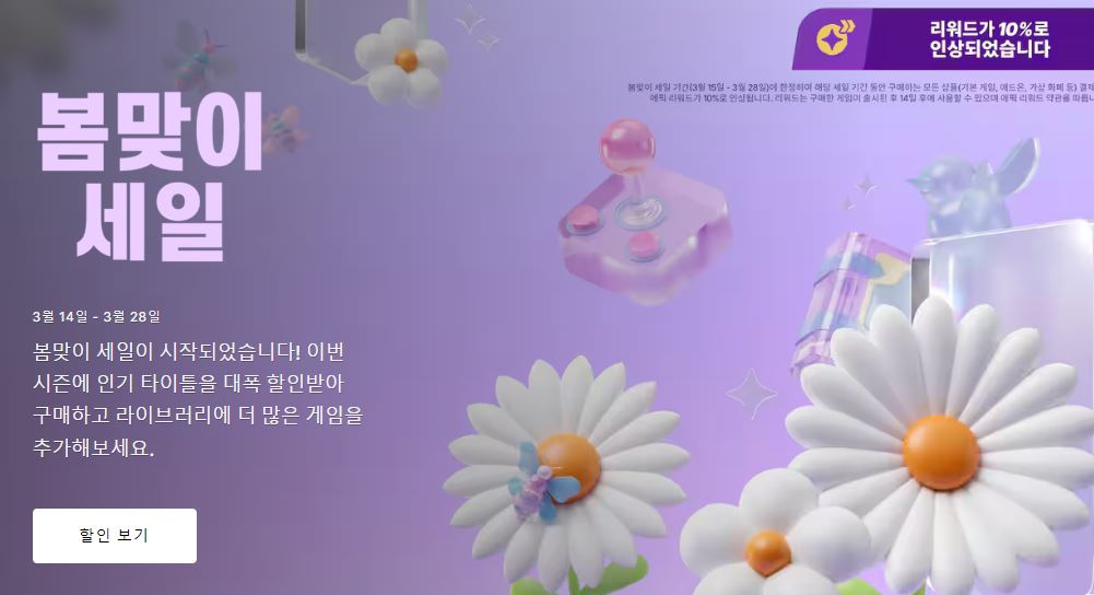 에픽게임즈 봄맞이 세일 에픽게임즈 봄맞이 세일 정보 포스팅입니다. 에픽게임즈 다양한 게임을 할인 판매하네요. 할인 게임 : 데드아일랜드2, 앨런웨이크2 등 이벤트 기간 : 2024년 3월 28일까지 에픽게임즈 봄맞이 세일 정보 [링크] 핫딜/PC&가전 2024.03.16