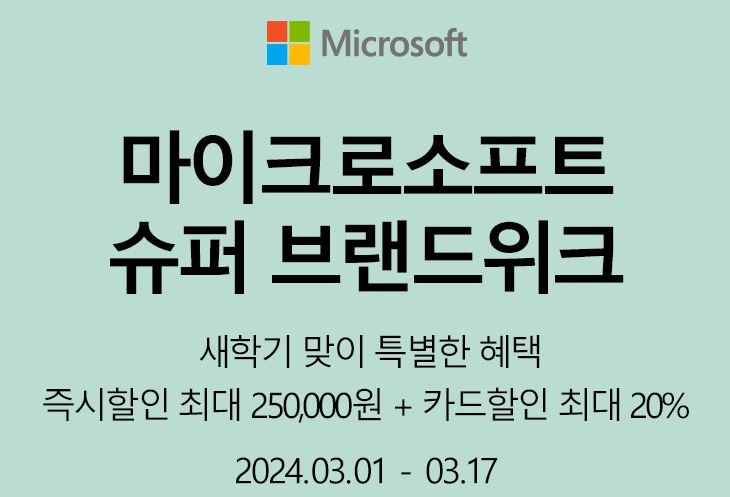 마이크로소프트 슈퍼 브랜드 위크 마이크로소프트 슈퍼 브랜드 위크 정보 포스팅입니다. 마이크로소프트 다양한 제품을 할인 판매하네요. 할인 품목 : 노트북, 키보드 등 추가 카드 할인 최대 20% 이벤트 기간 : 2024년 3월 17일까지 마이크로소프트 슈퍼 브랜드 위크 정보 [링크] "이 포스팅은 쿠팡 파트너스 활동의 일환으로 이에 따른 일정액의 수수료를 제공 받습니다" 핫딜/PC&가전 2024.03.12