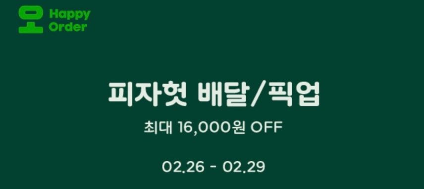 해피오더 피자헛 최대 16000원 할인 해피오더 피자헛 최대 16000원 할인 정보 포스팅입니다. 해피오더앱에서 피자헛 할인 이벤트를 진행하네요. 23900원 이상 주문 시 방문포장 16000원 할인 21900원 이상 주문 시 배달 8000원 할인 이벤트 기간 : 2024년 2월 26일 ~ 2024년 2월 29일 핫딜/식품&생활 2024.02.26