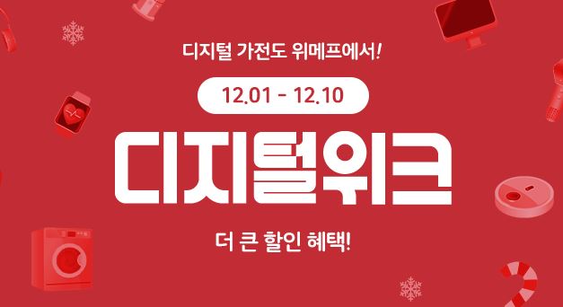 위메프 디지털 위크 이벤트 위메프 디지털 위크 이벤트 정보 포스팅입니다. 위메프 다양한 제품을 할인 판매하네요. 할인 품목 : 노트북, 그래픽카드, 휴대폰, 생활가전 등 이벤트 기간 : 2023년 12월 10일까지 위메프 디지털 위크 이벤트 정보 [링크] 핫딜/PC&가전 2023.12.10