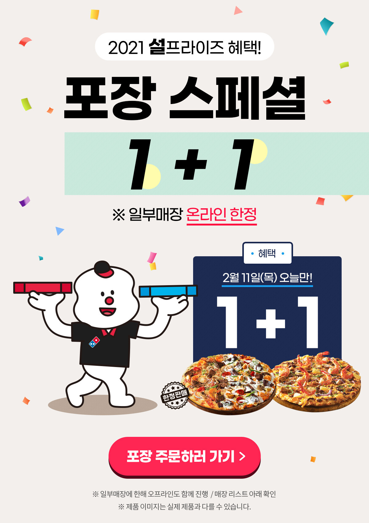 도미노피자 설프라이즈 포장 1+1 이벤트 도미노피자 설프라이즈 포장 1+1 이벤트 정보 포스팅입니다. 도미노피자 포장 주문 1+1 이벤트를 진행하네요. 이벤트 기간 : 2021년 2월 11일 도미노피자 설프라이즈 포장 1+1 이벤트 정보 [링크] 핫딜/식품&생활 2021.02.11