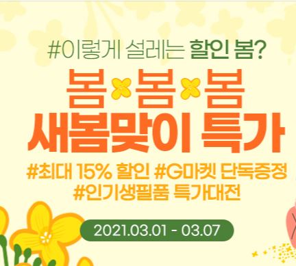 G마켓 인기생필품 특가대전 G마켓 인기생필품 특가대전 정보 포스팅입니다. G마켓 사이트에서 할인 이벤트를 진행하네요. 할인 품목 : 세제, 칫솔, 손소독제 등 이벤트 기간 : 2021년 3월 7일까지 G마켓 인기생필품 특가대전 정보 [링크] 핫딜/식품&생활 2021.03.02