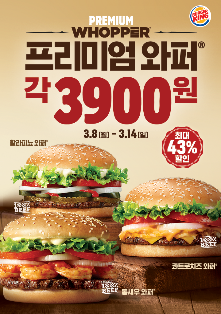버거킹 프리미엄 와퍼 최대 43% 할인 버거킹 프리미엄 와퍼 최대 43% 할인 정보 포스팅입니다. 버거킹 프리미어 와퍼 할인 이벤트를 진행하네요. 할인 메뉴 : 통새우와퍼, 할라피뇨와퍼, 콰트로치즈와퍼 이벤트 가격 3900원 이벤트 기간 : 2021년 3월 8일 ~ 3월 14일 핫딜/식품&생활 2021.03.08