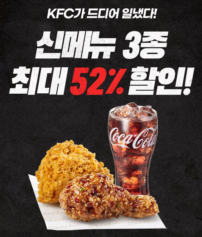 KFC 신메뉴 3종 최대 52% 할인 KFC 신메뉴 3종 최대 52% 할인 정보 포스팅입니다. KFC 다양한 메뉴를 할인 판매하네요. 할인 메뉴 : 징거치킨둘세트, 고스트앤불고기팩 등 KFC 신메뉴 3종 최대 52% 할인 정보 [링크] 핫딜/식품&생활 2021.03.08