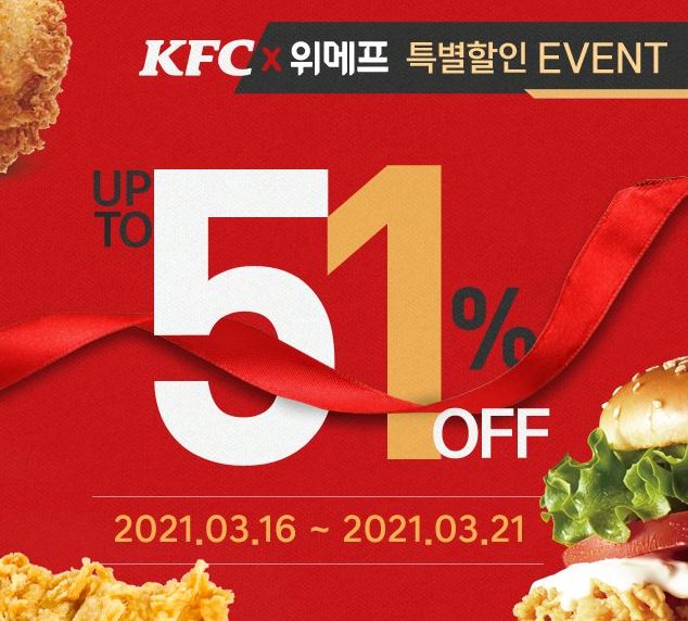 KFC 최대 51% 할인 KFC 최대 51% 할인 정보 포스팅입니다. KFC 다양한 메뉴를 할인 판매하네요. 할인 메뉴 : 트위스터블랙라벨세트, 오반치반치킨세트 등 이벤트 기간 : 2021년 3월 21일까지 KFC 최대 51% 할인 정보 [링크] 핫딜/식품&생활 2021.03.17