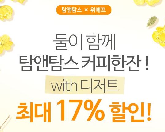 탐앤탐스 최대 17% 할인 탐앤탐스 최대 17% 할인 정보 포스팅입니다. 탐앤탐스 다양한 메뉴를 할인 판매하네요. 할인 메뉴 : 자바칩 탐앤치노, 카페라떼 등 탐앤탐스 최대 17% 할인 정보 [링크] 핫딜/식품&생활 2021.04.30