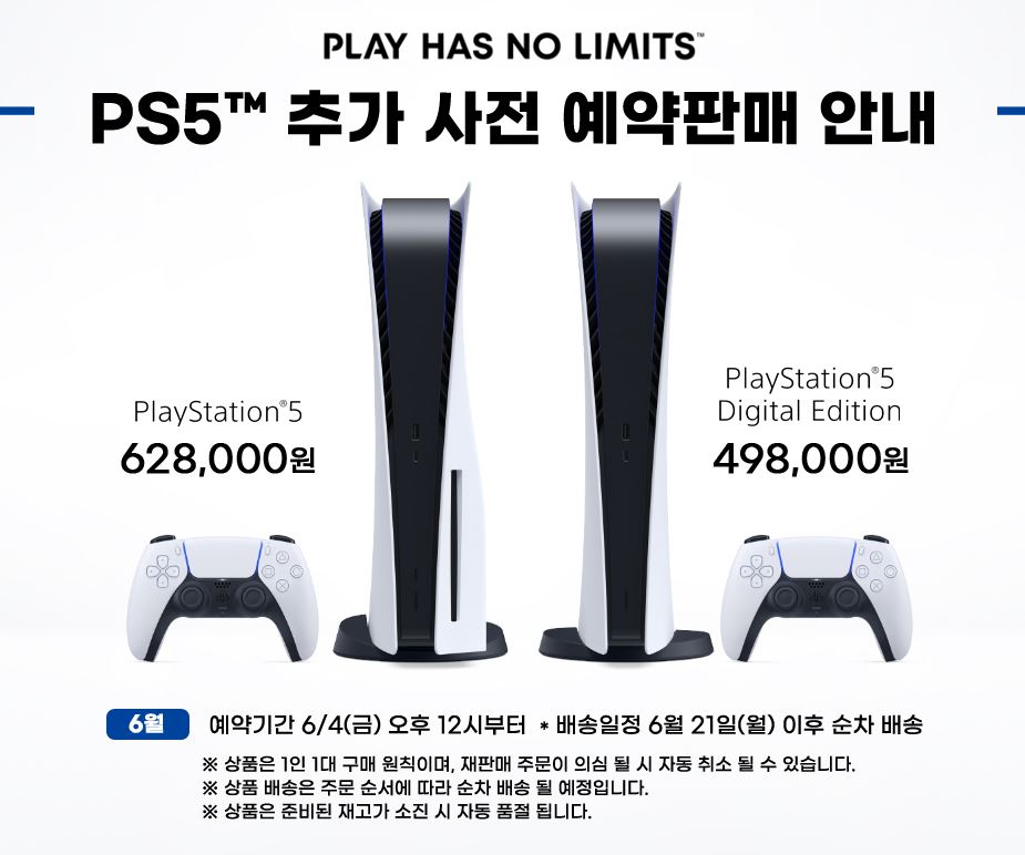 PS5 사전 예약 판매 PS5 사전 예약 판매 정보 포스팅입니다. PS5 사전 예약을 하네요. 예약 판매 시간 : 2021년 6월 4일 낮 12시 배송일정 : 2021년 6월 21일 이후 순차 배송 SSG howdy [링크] SSG [링크] 하이마트 [링크] 핫딜/PC&가전 2021.06.04