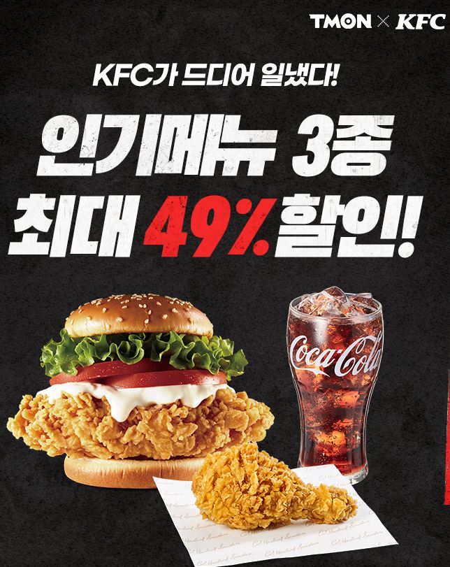 KFC 인기메뉴 3종 최대 49% 할인 KFC 인기메뉴 3종 최대 49% 할인 정보 포스팅입니다. KFC 다양한 메뉴를 할인 판매하네요. 할인 메뉴 : 징거치킨세트, 갓양념앤치킨세트 등 KFC 인기메뉴 3종 최대 49% 할인 정보 [링크] 핫딜/식품&생활 2021.09.06