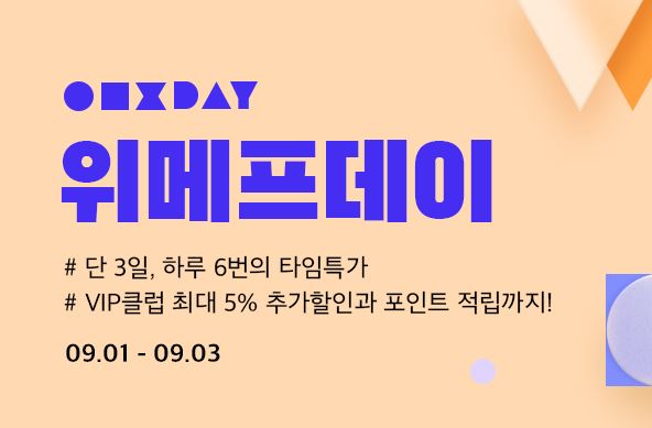 위메프데이 이벤트 위메프데이 이벤트 정보 포스팅입니다. 위메프 사이트에서 할인 이벤트를 진행하네요. 할인 품목 : 화장품, 의류, 식품 등 이벤트 기간 : 2021년 9월 1일 ~ 2021년 9월 3일 위메프데이 이벤트 정보 [링크] 핫딜/패션&스포츠 2021.09.01