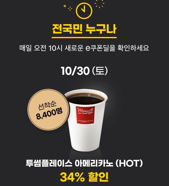 투썸 아메리카노 34% 할인 투썸 아메리카노 34% 할인 정보 포스팅입니다. 투썸 아메리카노를 할인 판매하네요. 선착순 8400원 판매 시간 : 2021년 10월 30일 오전 10시 G마켓 [링크] 옥션 [링크] 핫딜/식품&생활 2021.10.30