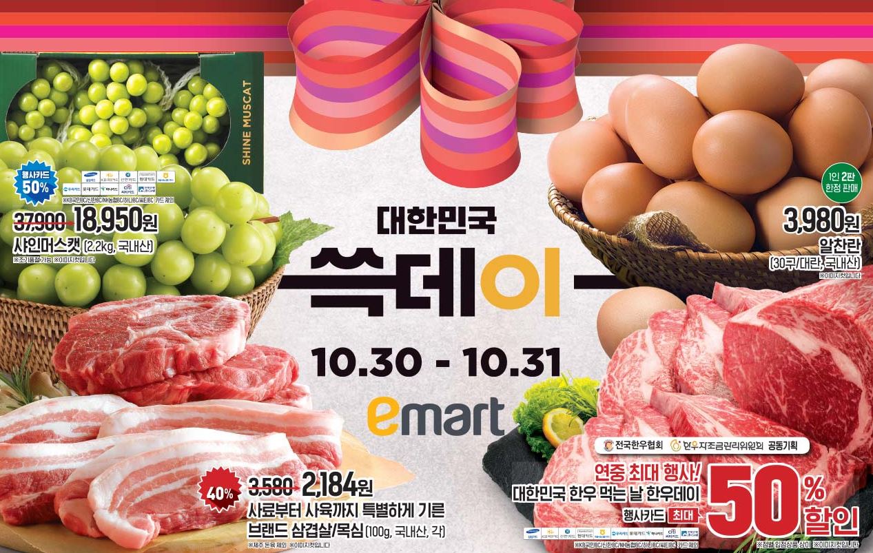 이마트 쓱데이 본행사 이벤트 이마트 쓱데이 본행사 이벤트 정보 포스팅입니다. 이마트 사이트에서 할인 이벤트를 진행하네요. 할인 품목 : 샤인머스캣, 삼결살, 장어 등 이벤트 기간 : 2021년 10월 30일 ~ 2021년 10월 31일 이마트 쓱데이 본행사 이벤트 정보 [링크] 핫딜/식품&생활 2021.10.31