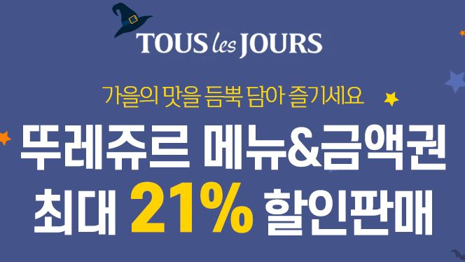 뚜레쥬르 메뉴 & 금액권 최대 21% 할인 뚜레쥬르 메뉴 & 금액권 최대 21% 할인 정보 포스팅입니다. 뚜레쥬르 다양한 제품을 할인 판매하네요. 할인 품목 : 1만원 제품교환권, 어몽어스 할로윈쇼콜라 등 뚜레쥬르 메뉴 & 금액권 최대 21% 할인 정보 [링크] 핫딜/식품&생활 2021.10.25
