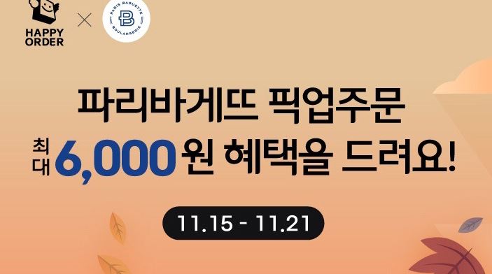 해피오더 파리바게트 픽업주문 최대 6000원 할인 해피오더 파리바게트 픽업주문 최대 6000원 할인 정보 포스팅입니다. 해피오더 앱에서 파리바게트 할인 이벤트를 진행하네요. 픽업 주문 12000원 이상 주문 시 4000원 할인 쿠폰. 결제 방법에 따라 2000원 추가 할인 (매일 오전 10시 30분 선착순) 이벤트 기간 : 2021년 11월 15일 ~ 2021년 11월 21일 핫딜/식품&생활 2021.11.15