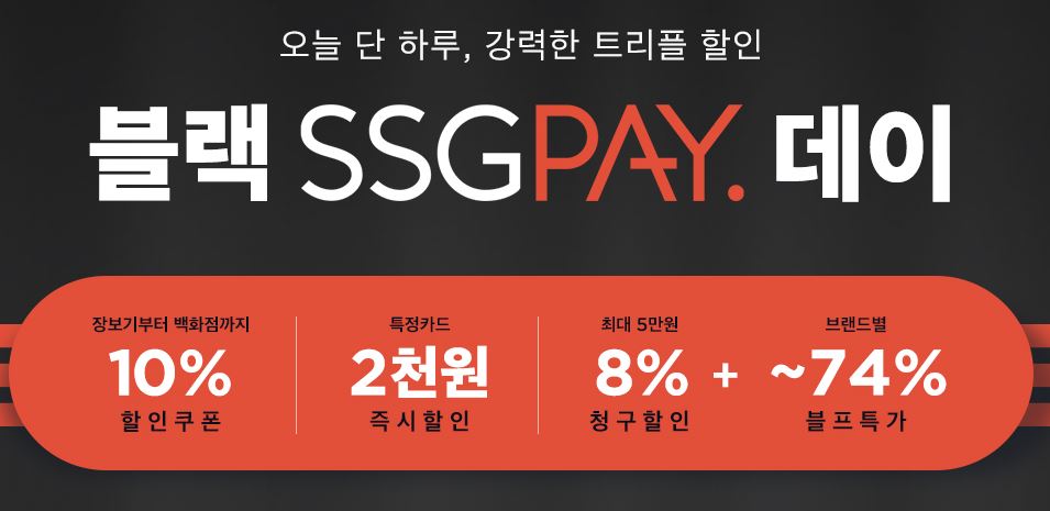 SSG 블랙 SSGPAY 데이 SSG 블랙 SSGPAY 데이 정보 포스팅입니다. SSG 사이트에서 할인 이벤트를 진행하네요. 할인 품목 : 의류, 가전, 화장품 등 SSG 블랙 SSGPAY 데이 정보 [링크] 핫딜/패션&스포츠 2021.11.22