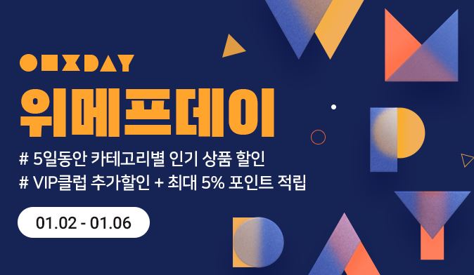 위메프데이 이벤트 위메프데이 이벤트 정보 포스팅입니다. 위메프 사이트에서 할인 이벤트를 진행하네요. 할인 품목 : 식품, 화장품, 의류 등 이벤트 기간 : 2022년 1월 6일까지 위메프데이 이벤트 정보 [링크] 핫딜/패션&스포츠 2022.01.03