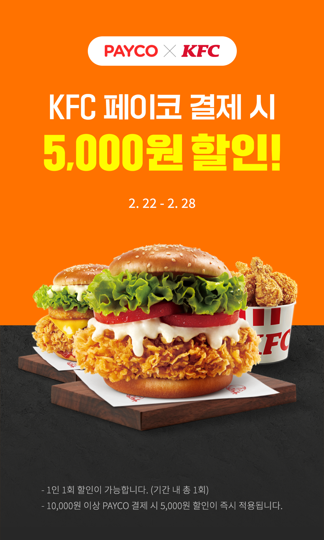 KFC 할인 이벤트 KFC 할인 이벤트 정보 포스팅입니다. KFC 다양한 이벤트를 진행하네요. KFC 매장에서 페이코 결제 시 5000원 할인 이벤트 기간 : 2022년 2월 28일까지 KFC 앱에서 버거 1+1 이벤트 이벤트 기간 : 2022년 2월 24일까지 핫딜/식품&생활 2022.02.22