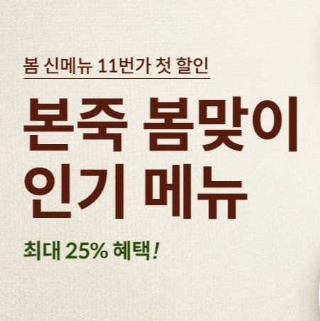 본죽 봄맞이 인기메뉴 최대 25% 할인 본죽 봄맞이 인기메뉴 최대 25% 할인 정보 포스팅입니다. 본죽 다양한 메뉴를 할인 판매하네요. 할인 메뉴 : 돈불백비빔밥, 끼리 크림치즈 단호박죽 등 본죽 봄맞이 인기메뉴 최대 25% 할인 정보 [링크] 핫딜/식품&생활 2022.02.22