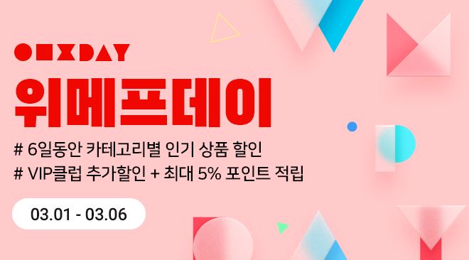 위메프데이 이벤트 위메프데이 이벤트 정보 포스팅입니다. 위메프 사이트에서 할인 이벤트를 진행하네요. 할인 품목 : 의류, 화장품, 식품 등 이벤트 기간 : 2022년 3월 6일까지 위메프데이 이벤트 정보 [링크] 핫딜/패션&스포츠 2022.03.02