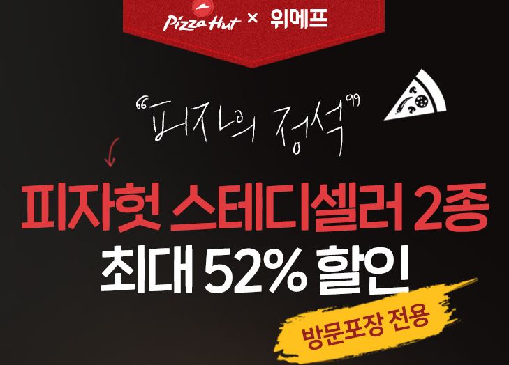 피자헛 스테디셀러 2종 최대 52% 할인 피자헛 스테디셀러 2종 최대 52% 할인 정보 포스팅입니다. 피자헛 다양한 메뉴를 할인 판매하네요. 할인 메뉴 : 프리미엄 수퍼슈프림 리치골드, 프리미엄 수퍼슈프림 치즈크러스트 방문포장 전용 피자헛 스테디셀러 2종 최대 52% 할인 정보 [링크] 핫딜/식품&생활 2022.03.16