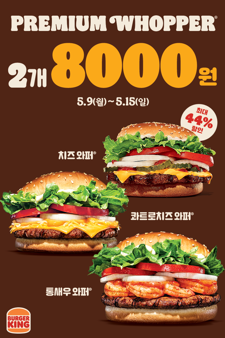 버거킹 프리미엄 와퍼 할인 이벤트 버거킹 프리미엄 와퍼 할인 이벤트 정보 포스팅입니다. 버거킹 프리미엄 와퍼 2개 구입시 8000원 이벤트를 진행하네요. 이벤트 메뉴 : 치즈와퍼, 콰트로치즈와퍼, 통새우와퍼 이벤트 기간 : 2022년 5월 9일 ~ 2022년 5월 15일 핫딜/식품&생활 2022.05.09