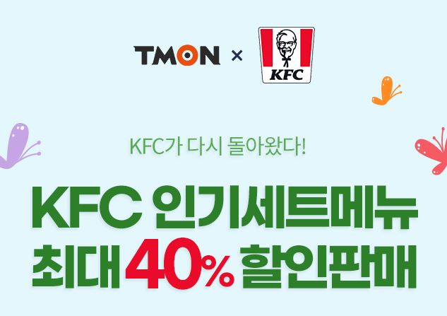 KFC 인기세트메뉴 최대 40% 할인 KFC 인기세트메뉴 최대 40% 할인 정보 포스팅입니다. KFC 다양한 메뉴를 할인 판매하네요. 할인 품목 : 징거텐더세트, 트리플치킨세트 등 KFC 인기세트메뉴 최대 40% 할인 정보 [링크] 핫딜/식품&생활 2022.05.09