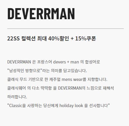 DEVERRMAN 22SS 최대 40% 세일 DEVERRMAN 22SS 최대 40% 세일 정보 포스팅입니다. DEVERRMAN 다양한 제품을 할인 판매하네요 할인 품목 : 티셔츠, 셔츠 등 DEVERRMAN 22SS 최대 40% 세일 정보 [링크] 핫딜/패션&스포츠 2022.05.24