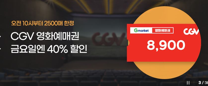 CGV 영화예매권 40% 할인 CGV 영화예매권 40% 할인 정보 포스팅입니다. CGV 영화예매권을 할인 판매하네요. 정가 15000원 / 할인가 8900원 오전 10시 선착순 판매 G마켓 [링크] 옥션 [링크] 핫딜/식품&생활 2022.07.15