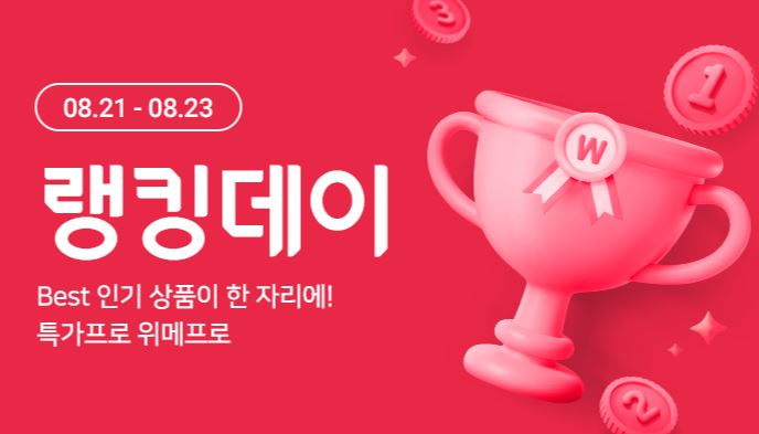 위메프 랭킹데이 할인 이벤트 위메프 랭킹데이 할인 이벤트 정보 포스팅입니다. 위메프 사이트에서 할인 이벤트를 진행하네요. 할인 품목 : 화장품, 의류, 식품 등 이벤트 기간 : 2022년 8월 21일 ~ 2022년 8월 23일 위메프 랭킹데이 할인 이벤트 정보 [링크] 핫딜/패션&스포츠 2022.08.21