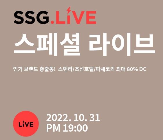 SSG 스페셜 라이브 이벤트 SSG 스페셜 라이브 이벤트 정보 포스팅입니다. SSG 스페셜 라이브 이벤트를 진행하네요. 할인 브랜드 : 파세코, 스탠리, 레고 등 라이브 시작 시간 : 2022년 10월 31일 오후 7시 SSG 스페셜 라이브 이벤트 정보 [링크] 핫딜/패션&스포츠 2022.10.31