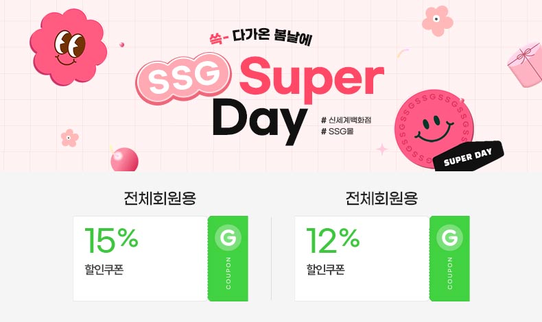 G마켓 SSG몰 슈퍼 데이 12% 할인쿠폰 이벤트 G마켓 SSG몰 슈퍼 데이 12% 할인쿠폰 이벤트 정보 포스팅입니다. G마켓 SSG몰 상품 할인 이벤트를 진행하네요. 전상품 12% 할인쿠폰 적용 G마켓 SSG몰 슈퍼 데이 12% 할인쿠폰 이벤트 정보 [링크] 핫딜/패션&스포츠 2023.03.27