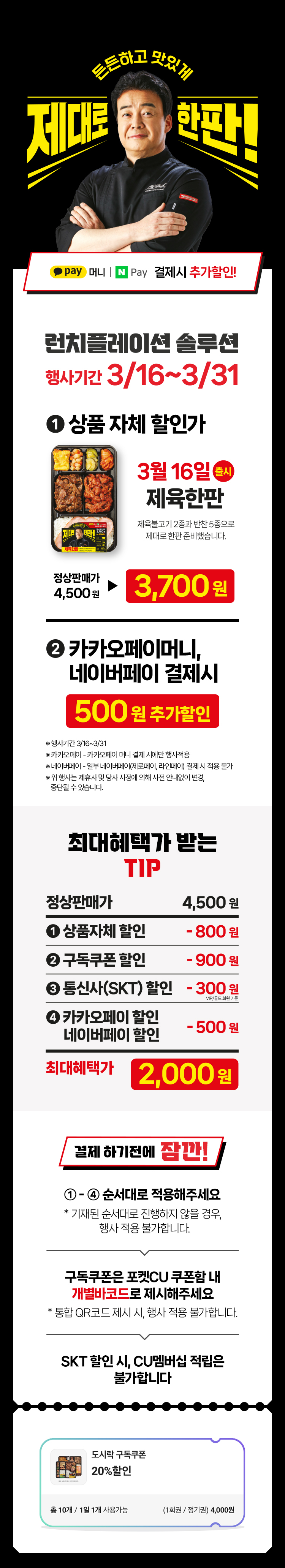 포켓CU 백종원 제육한판 할인 이벤트 포켓CU 백종원 제육한판 할인 이벤트 정보 포스팅입니다. 포켓CU앱에서 백종원 제육한판 이벤트를 진행하네요. 최대 할인가 2000원 이벤트 기간 : 2023년 3월 31일까지 포켓CU 백종원 제육한판 할인 이벤트 정보 [링크] 핫딜/식품&생활 2023.03.17
