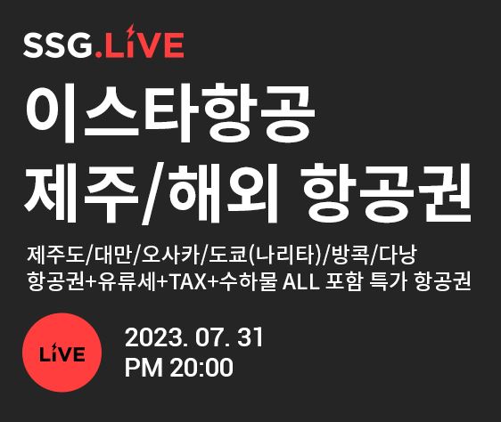 SSG.LIVE 이스타항공 제주/해외 항공권 최대 95% 할인 SSG.LIVE 이스타항공 제주/해외 항공권 최대 95% 할인 정보 포스팅입니다. SSG.LIVE 이스타항공 할인 이벤트를 진행하네요. 여행지 : 제주도, 대만, 방콕, 다낭 등 방송 시간 : 2023년 7월 31일 오후 8시 SSG.LIVE 방송은 모바일에 최적화 되어 있습니다. SSG.LIVE 이스타항공 제주/해외 항공권 최대 95% 할인 정보 [링크] 핫딜/식품&생활 2023.07.31