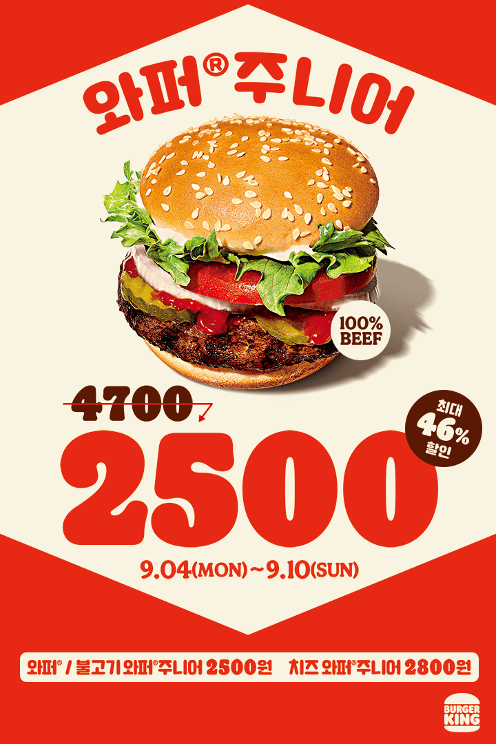 버거킹 와퍼주니어 할인 이벤트 버거킹 와퍼주니어 할인 이벤트 정보 포스팅입니다. 버거킹 와퍼주니어를 할인 판매하네요. 할인가 2500원 이벤트 기간 : 2023년 9월 4일 ~ 2023년 9월 10일 핫딜/식품&생활 2023.09.04