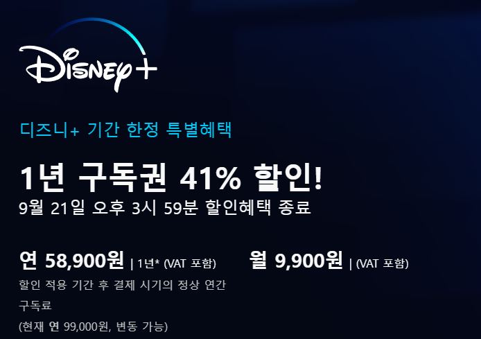 디즈니+ 1년 구독권 41% 할인 디즈니+ 1년 구독권 41% 할인 정보 포스팅입니다. 디즈니+ 1년 구독권을 할인 판매하네요. 할인가 58900원 이벤트 기간 : 2023년 9월 21일 오후 3시 59분 디즈니+ 1년 구독권 41% 할인 정보 [링크] 핫딜/식품&생활 2023.09.07