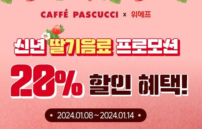 파스쿠찌 딸기음료 프로모션 20% 할인 파스쿠찌 딸기음료 프로모션 20% 할인 정보 포스팅입니다. 파스쿠찌 다양한 메뉴를 할인 판매하네요. 할인 메뉴 : 상큼달콤 딸기 세트, 딸기 쉐이크 세트 등 파스쿠찌 딸기음료 프로모션 20% 할인 정보 [링크] 핫딜/식품&생활 2024.01.08