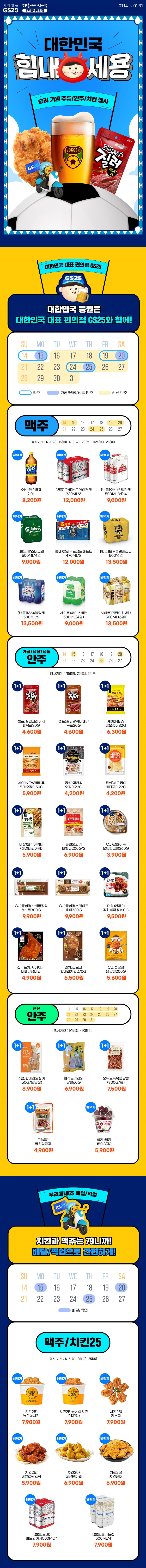GS25 주류/안주/치킨 할인 이벤트 GS25 주류/안주/치킨 할인 이벤트 정보 포스팅입니다. GS25 할인 이벤트를 진행하네요. 맥주 할인 : 2024년 1월 15일, 19일, 20일, 24일, 25일 가공/냉장/냉동 안주 할인 : 2024년 1월 15일, 20일, 25일 신선 안주 할인 : 2024년 1월 16일 ~ 2024년 1월 31일 핫딜/식품&생활 2024.01.15