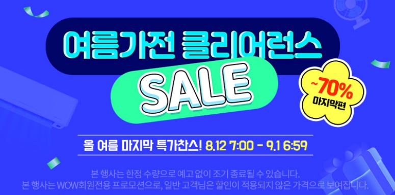 쿠팡 여름가전 클리어런스 최대 70% 세일 쿠팡 여름가전 클리어런스 최대 70% 세일 정보 포스팅입니다. 쿠팡 다양한 제품을 할인 판매하네요. 할인 품목 : 선풍기, 냉장고, 제습기 등 이벤트 기간 : 2024년 9월 1일 오전 6시 59분까지 쿠팡 여름가전 클리어런스 최대 70% 세일 정보 [링크] "이 포스팅은 제휴마케팅이 포함된 광고로 일정 커미션을 지급 받을 수 있습니다." 핫딜/PC&가전 2024.08.17