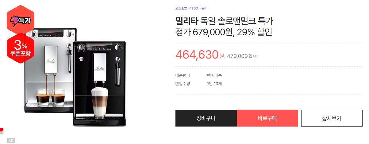 독일 밀리타 전자동 에스프레소 머신 카페오 솔로앤밀크 할인 독일 밀리타 전자동 에스프레소 머신 카페오 솔로앤밀크 할인 정보 포스팅입니다. 단순박스스크래치 상품을 할인 판매하네요. 할인가 464630원 무료배송 독일 밀리타 전자동 에스프레소 머신 카페오 솔로앤밀크 할인 정보 [링크] 핫딜/PC&가전 2024.08.19