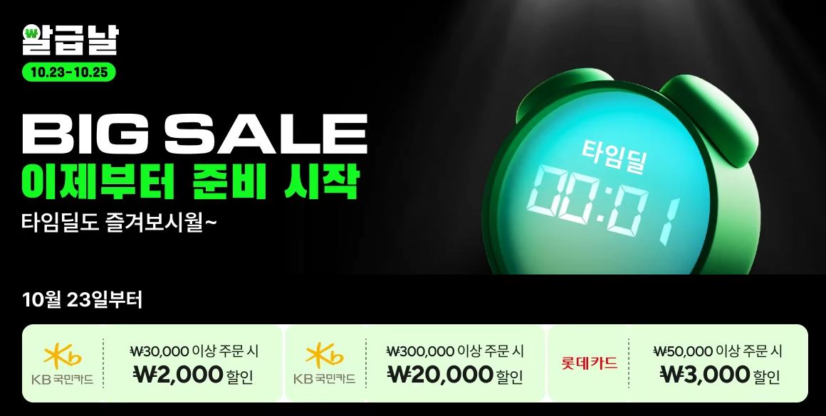 알리익스프레스 알급날 빅 세일 정보 포스팅입니다. 알리익스프레스 알급날 빅 세일 이벤트를 진행하네요. 할인 코드 *K-venue상품에만 적용 가능 - 29달러 이상 구매 시, 3달러 할인: PAYDAY03 - 99달러 이상 구매 시, 14달러 할인: PAYDAY14 - 199달러 이상 구매 시, 28달러 할인: PAYDAY28 결제 할인 - KB국민 카드: 30,000원 이상 구매 시, 2,000원 할인 300,000원 이상 구매 시, 20,000원 할인 -롯데 카드: 50,000원 이상 구매 시, 3,000원 할인 이벤트 기간 : 2024년 10월 23일 ~ 2023년 10월 25일  알리익스프레스 알급날 빅 세일 정보 [링크]