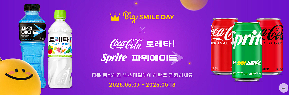 코카콜라 빅 스마일 데이 이벤트 코카콜라 빅 스마일 데이 이벤트 정보 포스팅입니다. 코카콜라 다양한 제품을 할인 판매하네요. 할인 품목 : 코카콜라, 환타, 조지아 등 이벤트 기간 : 2025년 5월 13일까지코카콜라 빅 스마일 데이 이벤트 정보 [링크] 핫딜/식품&생활 2025.05.09